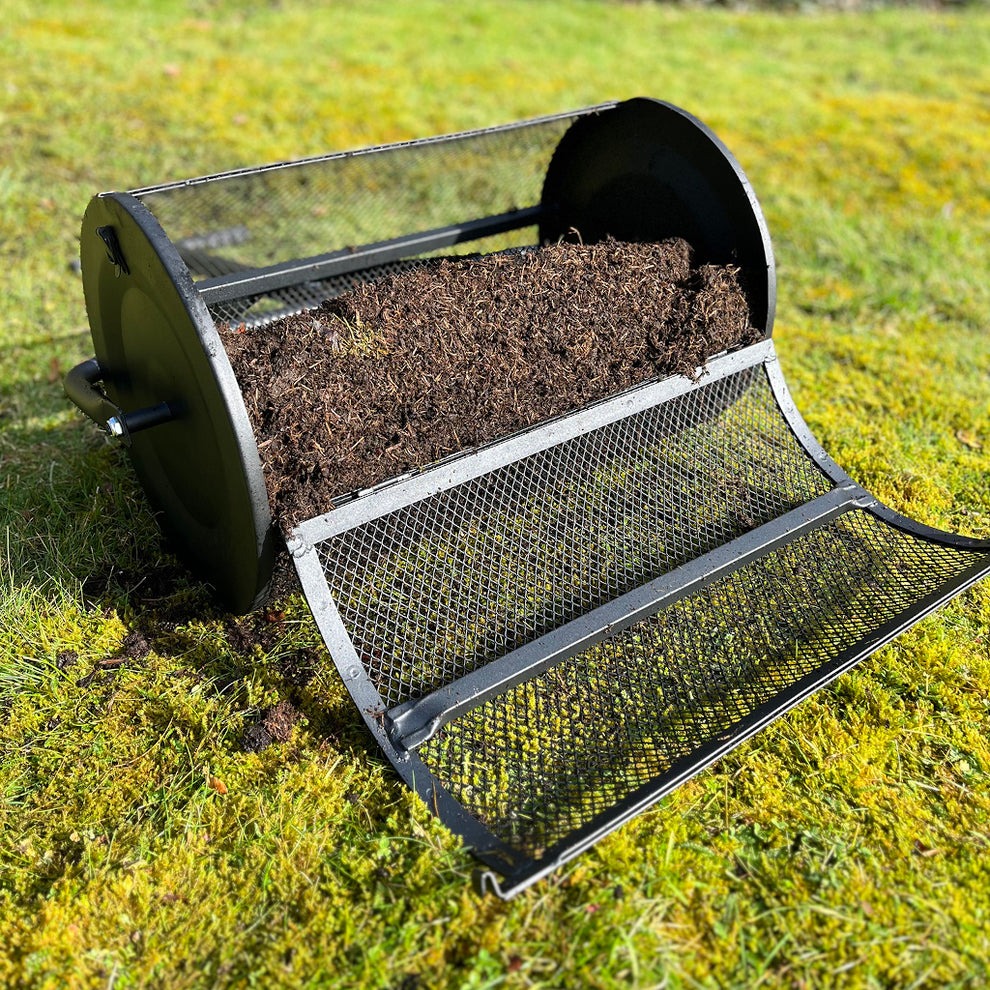 Mesh roller for spreading compost, soil, sand, and fertilizer evenly.